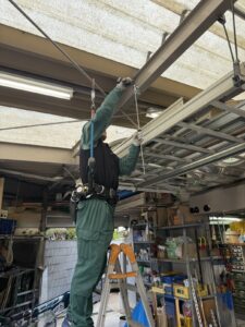 倉庫の空いている上部空間を活用し、ケーブルラックの設置作業の練習を行いました。