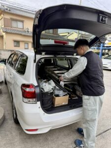 トラックに工具や材料を積み込み、明日の段取りをしています。