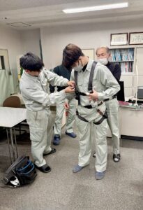 さらに、フルハーネスのサイズ合わせも行い、現場に向けた準備もスタートしています。