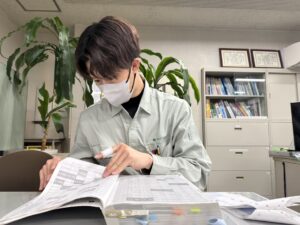 新入社員の研修ステップとして、現場で実際に使用している納品書(伝票)をもとに、材料の確認を行っています。